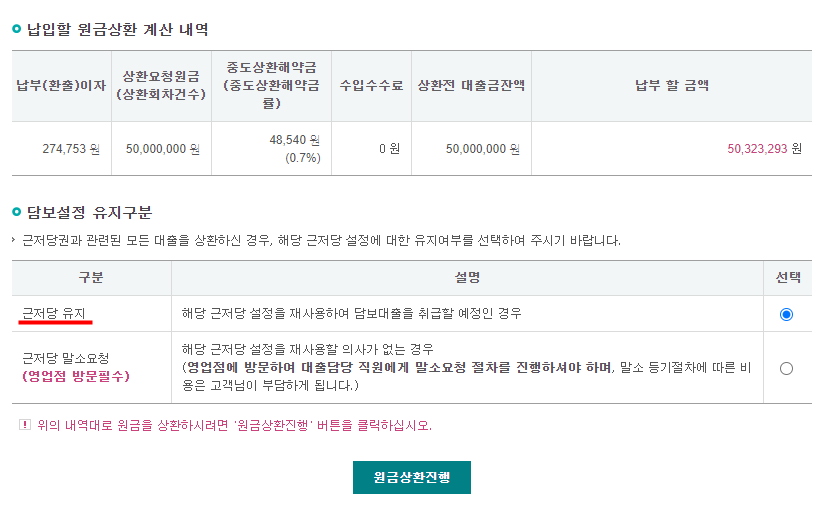 이는 각자의 상황에 맞게 선택하면 되는 것인데, 저의 경우 "근저당 유지"를 선택했습니다. 왜냐하면 나중에 또 대출을 받을 여지가 있기 때문인데, 근저당을 지금 말소해버리면 나중에 다시 대출 받을 경우 여러모로 절차가 복잡해지기 때문입니다.