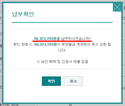 이제 [원금상환실행] 버튼을 클릭하면 아래와 같은 팝업이 뜨고 최종적으로 전액 상환이 완료됩니다.