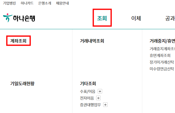 상단에 있는 메뉴 중 조회 > 계좌조회로 들어갑니다.