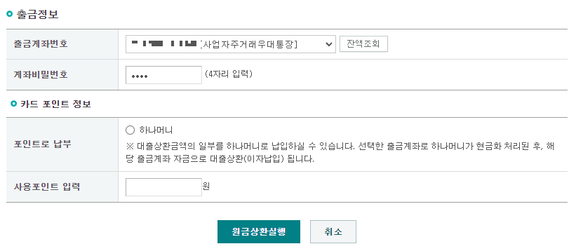 그러면 상환액을 어느 계좌에서 출금할지를 선택하게 됩니다. 하나은행 대출이므로 하나은행 계좌를 통해서만 출금처리가 가능하니 하나은행 계좌의 잔액을 꼭 체크해보시길 바랍니다.