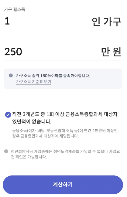 1인 가구에 월소득 250만원을 입력해봅니다. 이 글을 보시는 분들은 각자의 소득에 맞게 입력해주시면 됩니다.