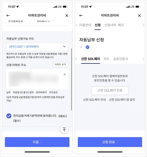 그렇게 신청 아파트 주소 정보까지 입력하고 기본약관에 동의하면 자동납부 신청 절차로 넘어가게 되는데요.