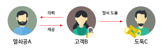 그런데 A가 열쇠를 잃어버렸고, 그 열쇠를 습득한 도둑 C가 자물쇠를 열어 B의 집을 털었습니다.