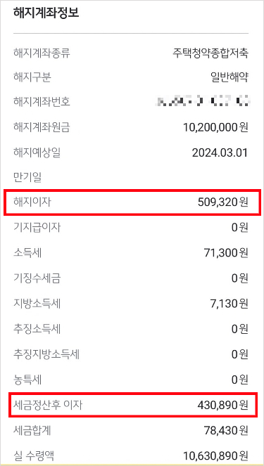 아래 화면은 제가 최종적으로 확인한 청약통장 해지시 받을 수 있는 예상 이자입니다.