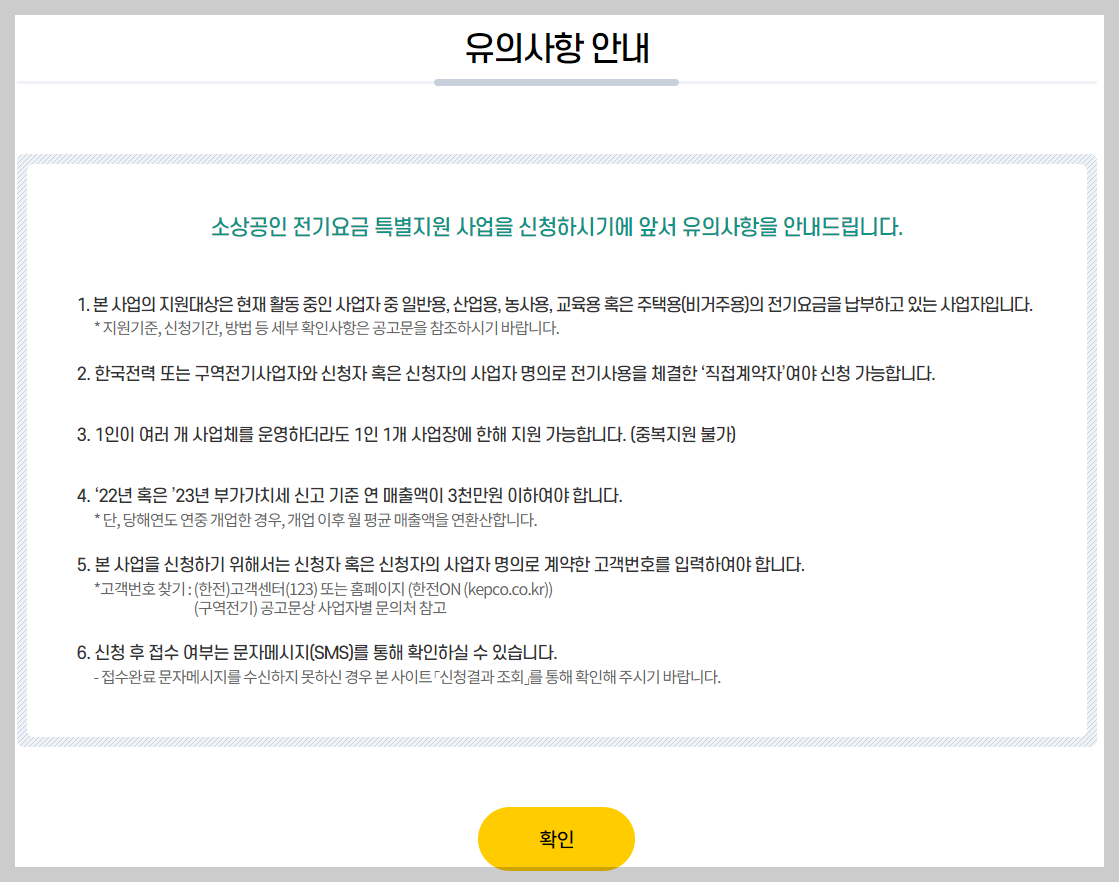 이 유의사항은 이 전기요금 특별지원을 받을 수 있는 사업자에 대한 요건이 나와있기에 해당이 안되시는 분은 아쉽게도 지원할 수가 없습니다. 가장 중요한 부분이기에 꼭 꼼꼼히 읽어보시길 바랍니다.