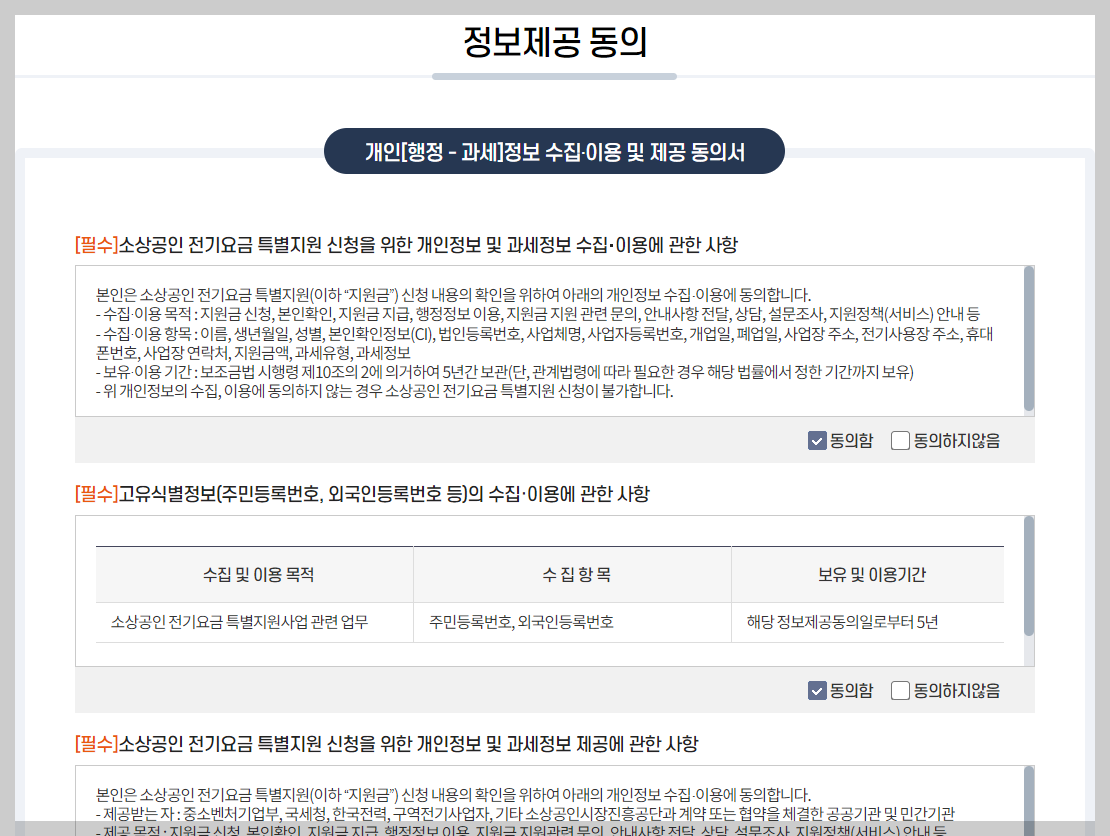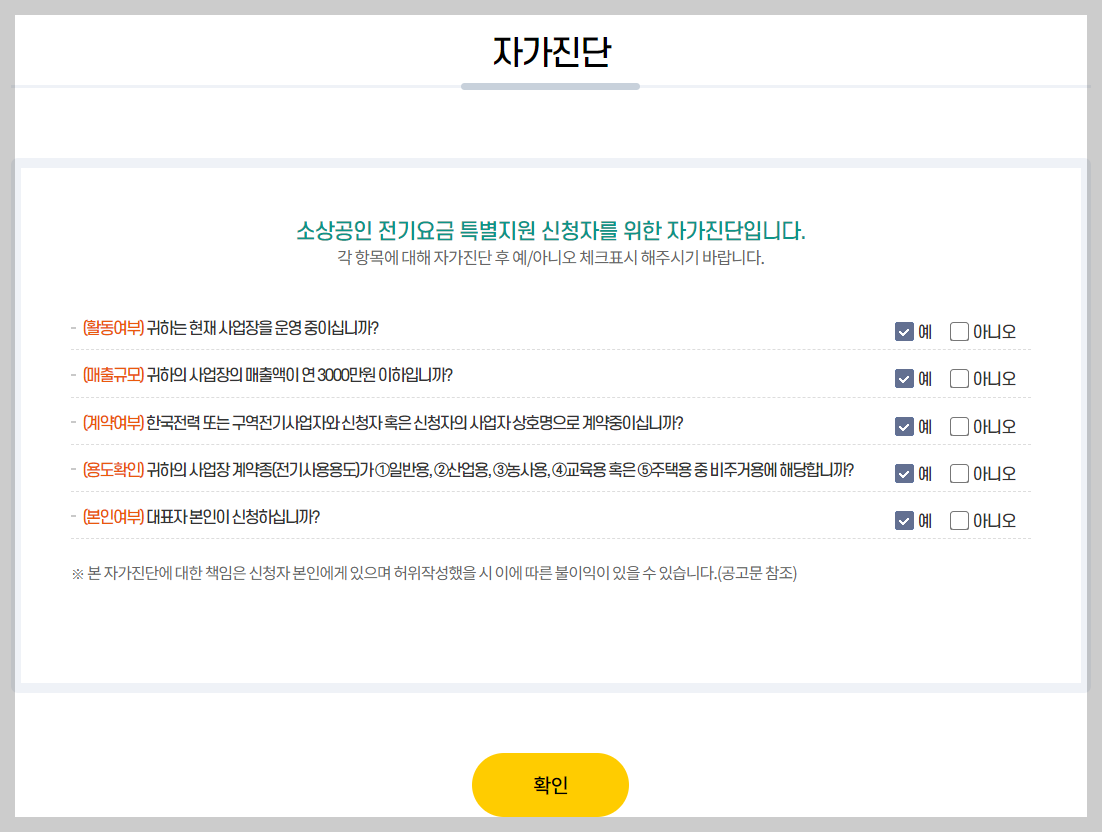 이 자가진단은 앞서 유의사항에 언급된 부분에 대해 신청자 본인이 해당사항이 있는지 직접 스스로 확인할 수 있도록 하는 절차입니다. 사업장 운영여부부터 연매출액, 전기계약 여부 등 총 5가지 질문을 하며, 이 중 하나라도 아니오에 해당하는 경우 신청이 어렵습니다.