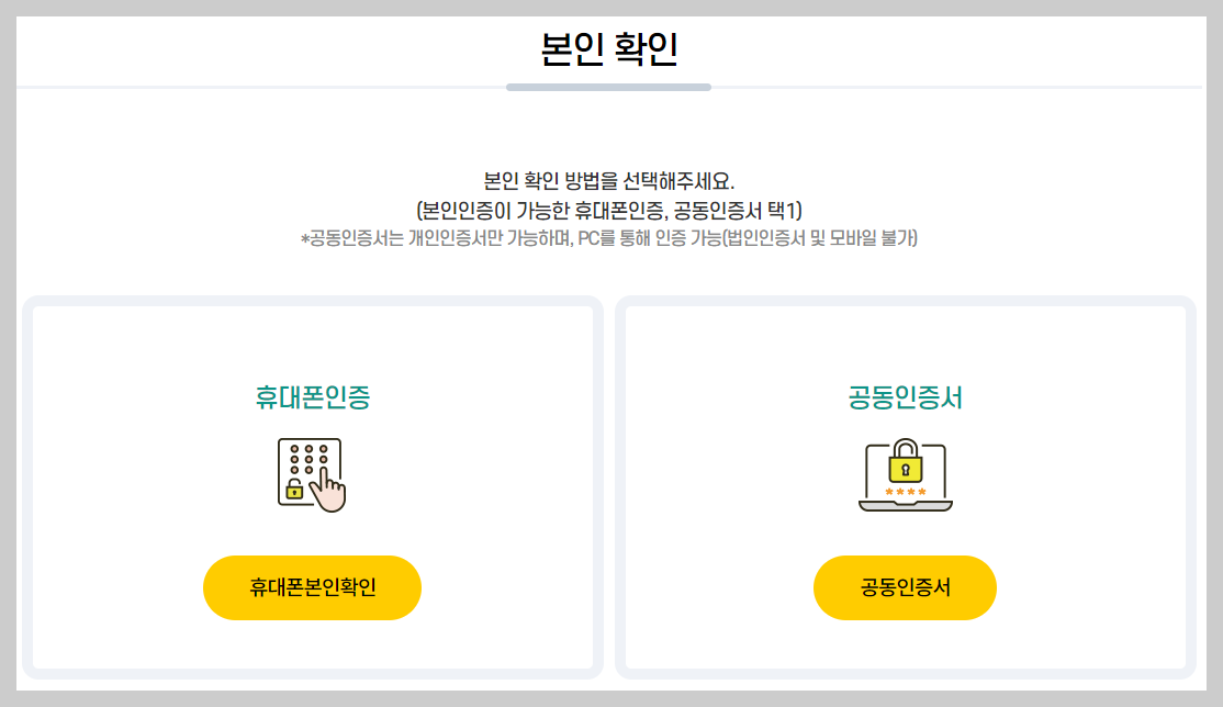 본인인증수단은 휴대폰인증과 공동인증서 두가지 방식을 제공합니다. 각자 편리한 수단을 선택해 본인인증을 진행하면 됩니다.