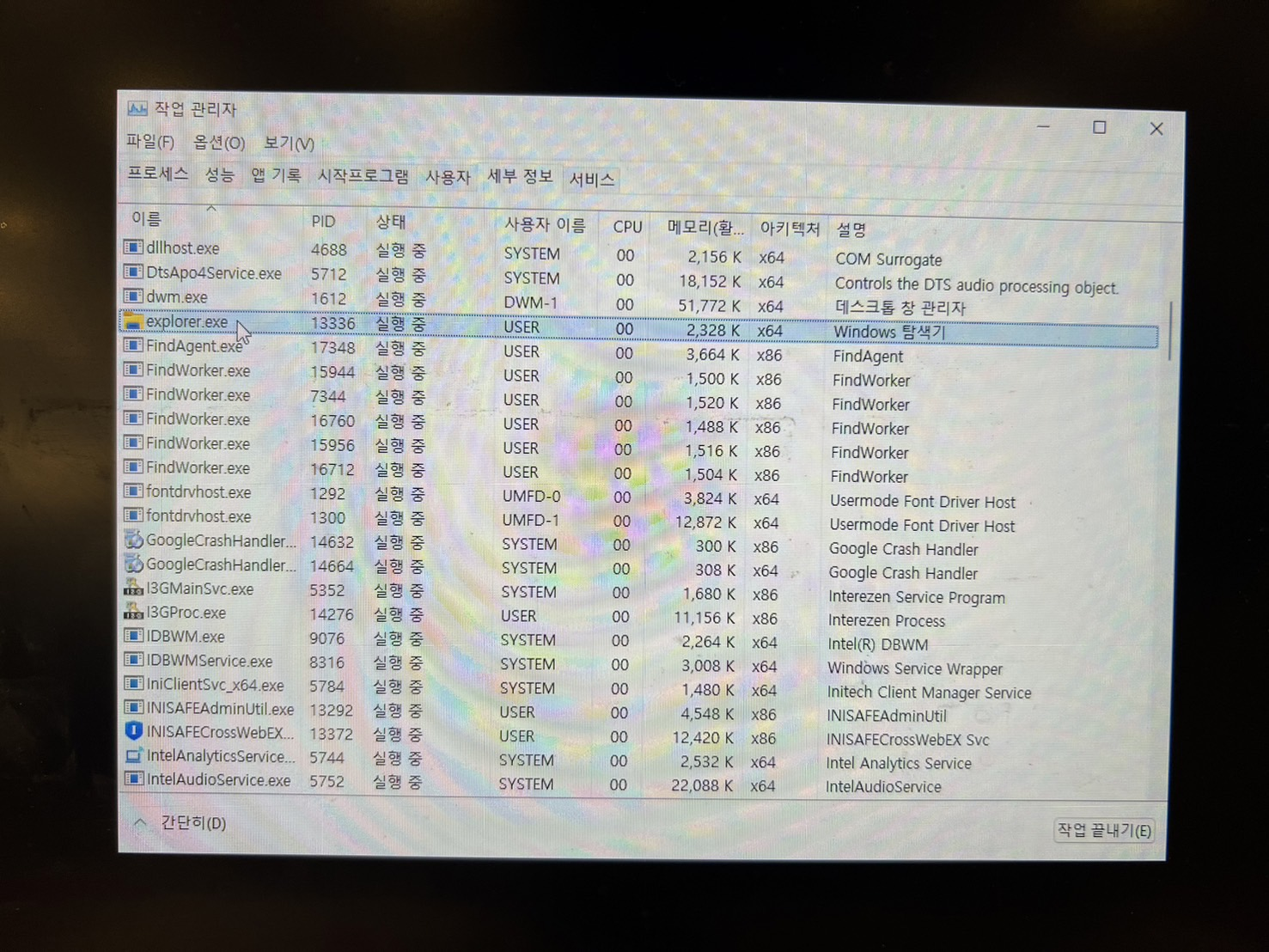 그 다음 하단 목록에서 explorer.exe 라는 이름을 찾습니다.