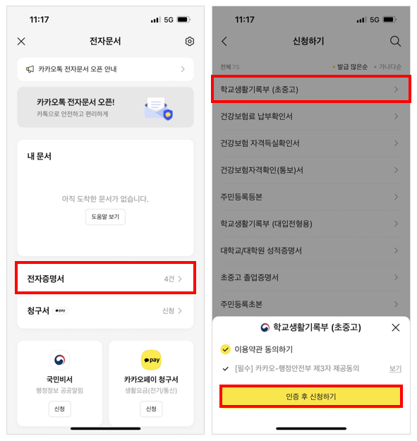 이 때 이용약관 동의 및 인증을 한 후에 신청할 수 있는데 카카오페이 간편인증으로 간편하게 인증할 수 있습니다.