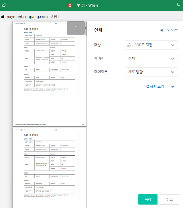 두개가 동일한 것이니 이 중에 아무거나 선택해서 영수증 출력을 해보겠습니다.