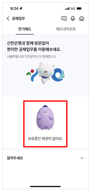 그러면 [공채 만기매도] 버튼이 보이고 이걸 누르면 나의 미상환 채권을 조회하실 수 있습니다. 여기서 유념하실 점은 온라인이라 하더라도 환급 신청 가능한 시간대가 따로 있고 평일 영업시간 기준으로만 가능하다는 점입니다.