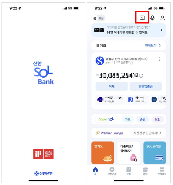 먼저 신한 Sol Bank 앱을 실행한 후 메인 화면에서 상단에 챗본 아이콘을 터치합니다.