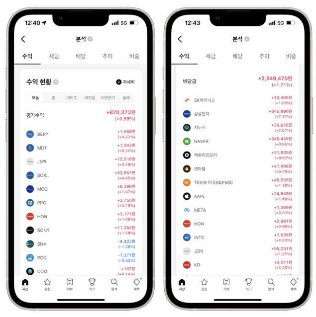 그 외에 다른 주식관리 앱에서 제공하는 수익, 세금, 비중 등 다양한 형태로 관리할 수 있고, 그 UI가 아주 직관적여서 개인적으로는 대만족 하는 앱입니다. 제가 여러가지 투자와 재테크를 하지만 개인적으로 가장 앱 실행 빈도가 높은 앱이라고 할 수 있습니다.
