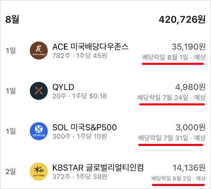 저의 경우 7월에는 총 188,653원의 배당금을 받을 예정인데, 1일날 받는 종목부터 해서 31일까지 각 종목별로 스케쥴링이 되어 일목요연하게 확인할 수 있어 무척 편리합니다.