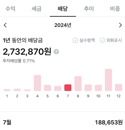 또한 그 동안의 수익내역과 지금까지 내가 받은 총 배당금의 액수도 한번에 확인할 수 있습니다.