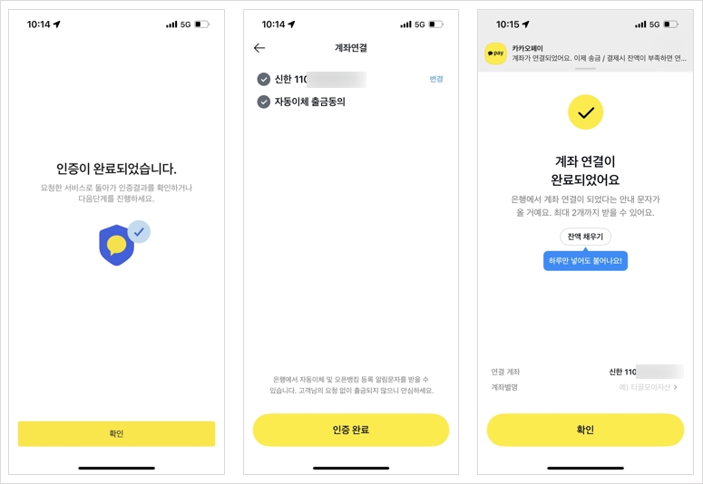 이 과정을 마치면 "계좌 연결이 완료되었어요" 라는 안내 화면이 나옵니다.