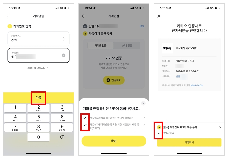 아래 화면처럼 은행을 선택하고 계좌번호를 입력한 후 [다음]을 누르면 몇가지 약관 동의와 카카오 인증서를 통한 전자서명을 진행하기만 하면 됩니다.