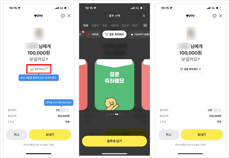 다만 조금 더 성의를 담아 봉투에 담아서 전달할 수도 있는데 화면 중앙에 [봉투에 담기] 버튼을 누르면 여러 유형의 봉투를 선택해 송금할 수 있습니다.