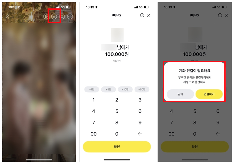 이 얼럿이 나오지 않았다면 그냥 송금하면 되지만 이 얼럿이 나왔다면 일단 계좌부터 연결해줘야 합니다.