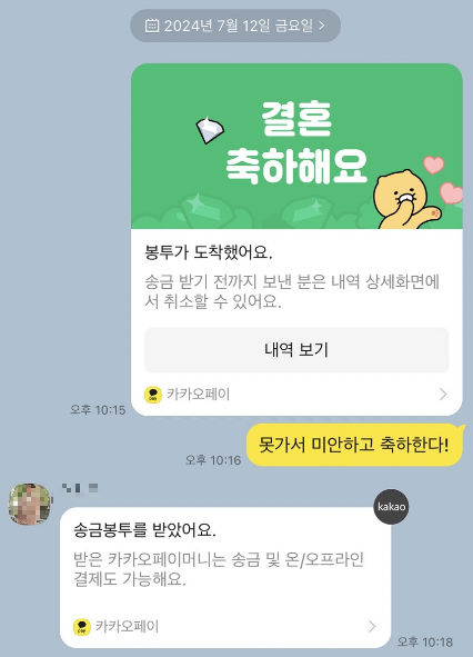 그런데 그 친구의 결혼식장이 부산이라서 수도권에 사는 저로서는 너무 멀어 참석하지 못하게 되었는데요. 그래서 미안한 마음을 담아 친구에게 축의금을 보냈습니다.