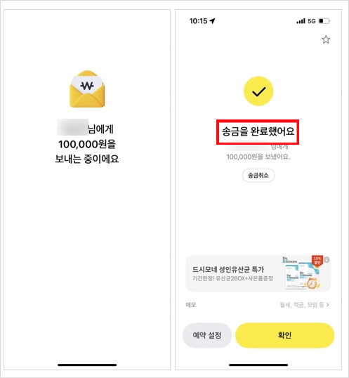 저는 축의금으로 10만원을 보낼 것이기에 아까 입력한 100,000원이 자동으로 뜨구요. 하단에 [보내기] 버튼을 누르면 아까 연결한 계좌에서 바로 출금이 되어 친구에게 돈이 보내집니다.