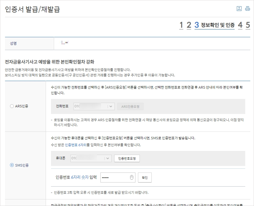 ARS인증, SMS인증 등 다양한 인증수단을 제공합니다. 저는 SMS인증이 가장 편해서 그걸로 진행했습니다.