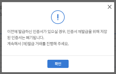 저처럼 이미 기존 공동인증서가 1년이 지나 만료된 사람도 아래와 같은 안내를 확인하실 수 있는데 그닥 중요한 부분은 아니라서 [확인] 버튼을 눌러 팝업을 닫아주시면 됩니다. 신경쓰지마세요.