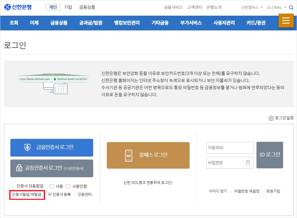 저는 신한은행이 주거래은행이기 때문에 신한은행 인터넷뱅킹 홈페이지를 통해 재발급을 받았습니다.