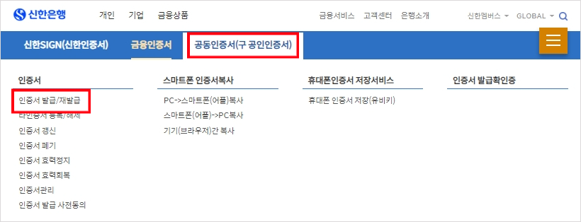 신한은행의 경우 인증서발급/재발급을 하면 디폴트로 금융인증서가 선택되어 진행됩니다.