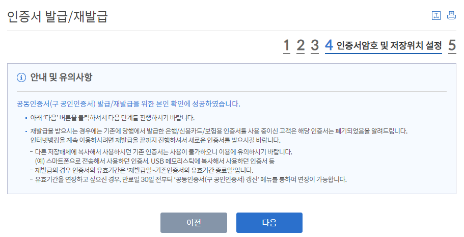 그렇게 저장 위치를 선택하고 인증서 암호를 설정하면 공동인증서 발급/재발급의 모든 과정이 끝이납니다.