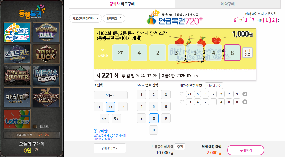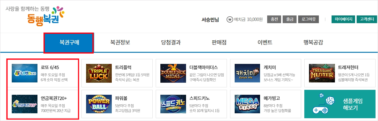 이렇게 충전한 2만원으로 동행복권 홈페이지에서 복권을 구매할 수 있습니다.
