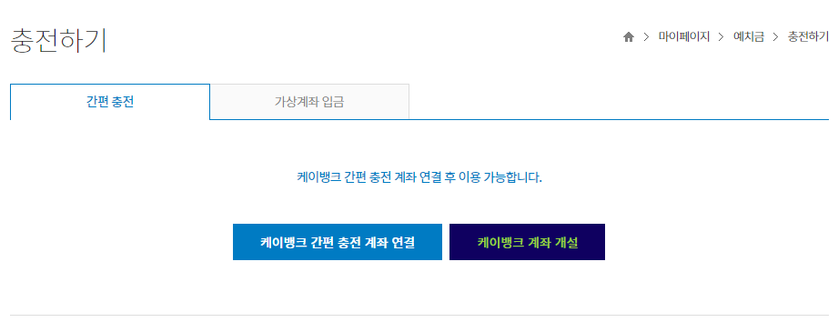 먼저 케이뱅크 간편 충전 계좌 연결을 해야하며, 케이뱅크 계좌가 없는 분들이라면 직접 계좌를 먼저 해야합니다.