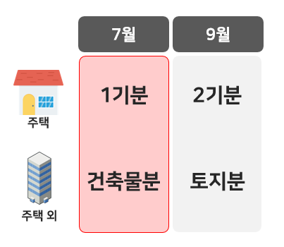 주택의 경우 7월에는 1기분을, 9월에는 2기분을 납부하게 되고, 주택 외 부동산이라면 7월에는 건축물분을 납부하고, 9월에는 토지분을 납부합니다. 주택은 1기와 2기가 딱 반반씩 나뉘어 세액이 결정 되지만 주택 외 부동산인 경우 건축물의 가치와 토지의 가치를 따로 계산해서 세액이 결정됩니다. 하지만 주택이든 아니든 상관없이 7월과 9월 납부하는 기간은 동일합니다.