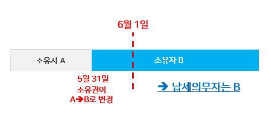 즉, A라는 사람이 B에게 부동산을 팔았다면 A와 B 둘 중에 한 명이 재산세를 내야하는 것인데요. 매년 6월 1일을 기준으로 소유한 사람이 재산세 독박(?)을 써야 합니다.