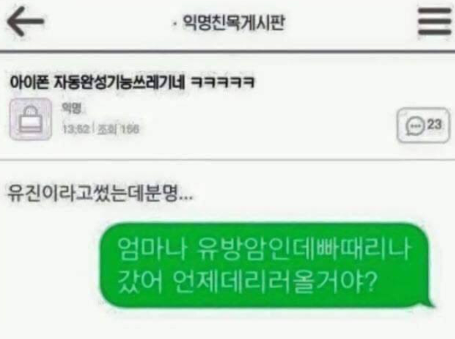 그런데 언제부턴가 아이폰을 새로 구매하면 자동으로 세팅되어 있는 자동완성 기능 때문에 여간 불편한 적이 한 두번이 아닙니다. 이 자동완성 기능은 원래 메시지를 입력할 때 좀 더 편리하게 입력해주도록 하기 위함인데, 실상은 자기 마음대로 전혀 엉뚱한 단어로 바꿔버리니 간혹 오해를 사는 대참사가 일어나기도 합니다. 그리고 이런 대참사 사례는 SNS에서 흔히 발견할 수 있죠.