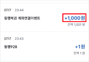 저는 이 혜택은 받을 수 있었는데, 아래와 같이 동행복권 계좌연결이벤트라는 이름으로 천원이 입금된걸 확인할 수 있습니다.