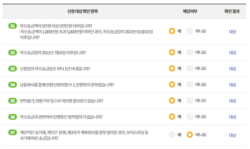 사이트 상단 메뉴에서 착오송금인 > 반환지원 신청하기 메뉴를 클릭하면 간단한 체크리스트 확인 후 신청서를 쓸 수 있습니다.