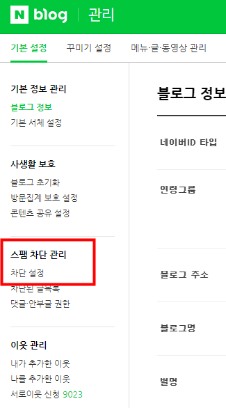 중간에 스팸차단관리 > 차단설정 메뉴가 보이는데 이 메뉴로 접근해봅니다.