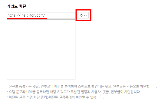 복사한 URL은 스팸차단관리 메뉴에 있는 키워드 차단에서 붙여넣기 해 차단을 합니다.