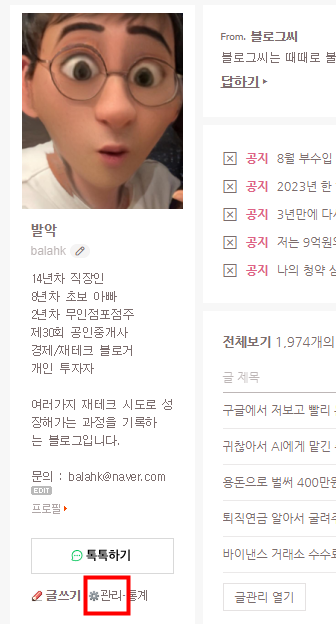 일단 블로그 PC웹에서 블로스 첫화면에 있는 [관리] 메뉴로 들어갑니다.