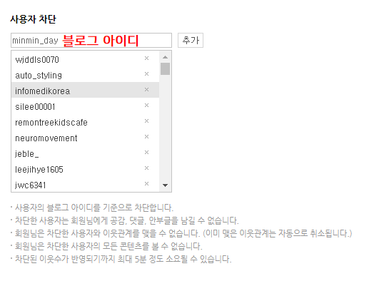 - 회원님은 차단한 사용자와 이웃관계를 맺을 수 없습니다. (이미 맺은 이웃관계는 자동으로 취소됩니다.)