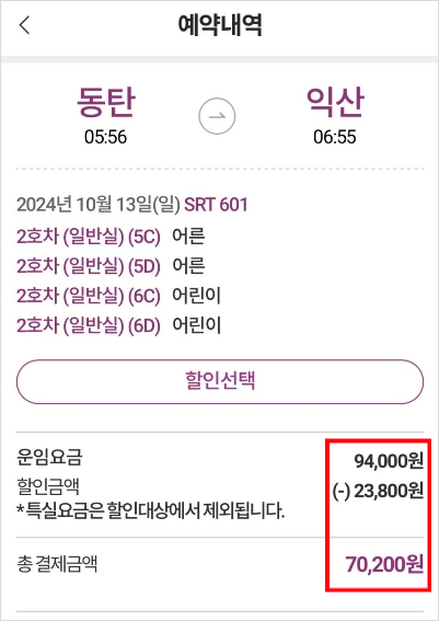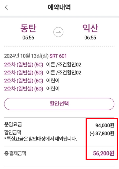 결국 다자녀 할인 혜택을 받으면 동탄에서 익산으로 가는 SRT 열차는 14,000원 정도 할인받게 되는 것입니다.