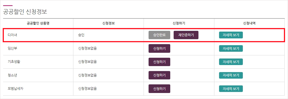 그러면 다시 [마이페이지] 에 접근해서 공공할인 신청정보를 확인하면 아래와 같이 정보가 갱신된걸 확인할 수 있습니다.