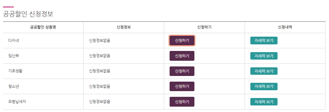 화면을 조금만 아래로 스크롤을 내리면 '공공할인 신청정보' 라는 영역이 보일텐데요. 여기 맨 윗칸에 '다자녀' 라는 항목이 보일겁니다. 그리고 그 옆에 [신청하기] 버튼을 클릭해 인증을 하면 됩니다.