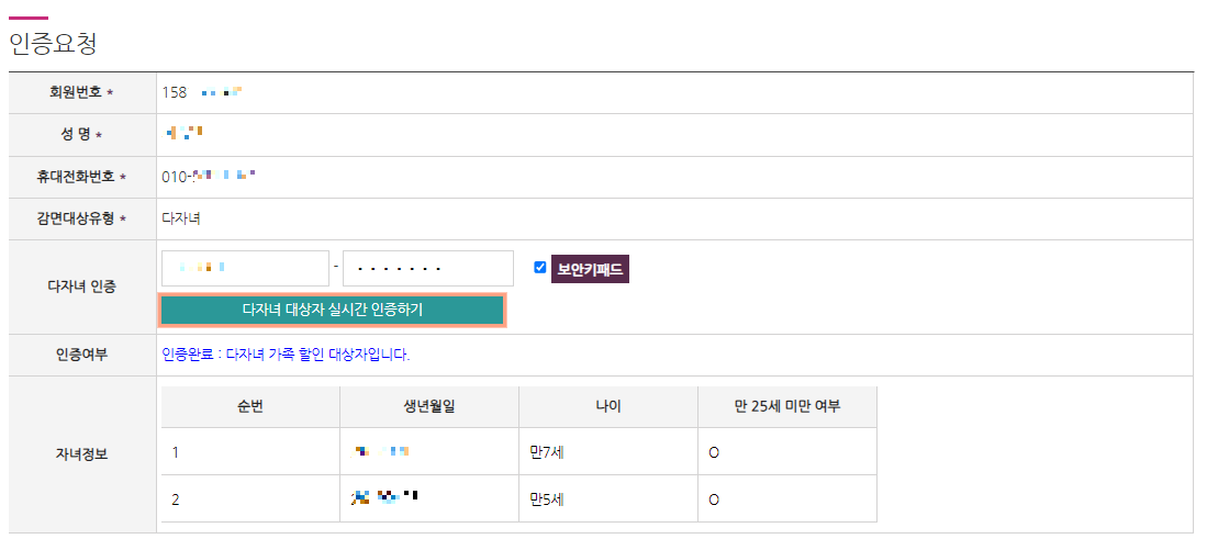 아래와 같이 인증요청 영역에서 자신의 정보를 확인하고 다자녀 인증란에서 실시간 인증하기 버튼을 클릭하면 전산상에서 알아서 체크되어 자녀정보가 조회됩니다. 저의 경우도 첫째와 둘째 아이 모두 정상적으로 조회가 되어 인증이 완료되었습니다.