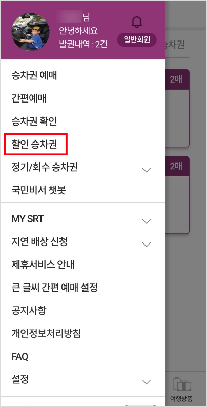 자, 이제 다자녀 인증이 완료되었으니 다시 로그인을 한 후 아까 접근했던 할인승차권 메뉴에 접근해봅니다.