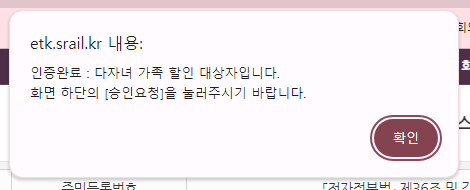 아마 여러분들은 이걸 신청한 적이 없을 것이기에 아래와 같은 얼럿이 떴을겁니다. 그렇다면 별도로 다자녀 인증 절차를 거쳐야 합니다.