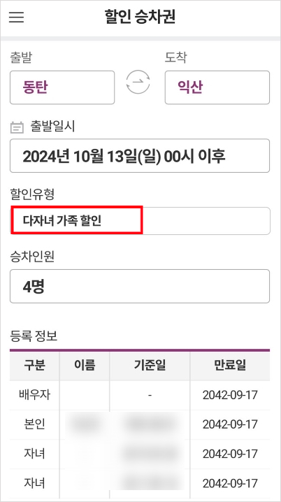 '할인 승차권' 메뉴를 눌러보면 자신이 다자녀로 등록되어있는지 바로 알 수 있습니다.