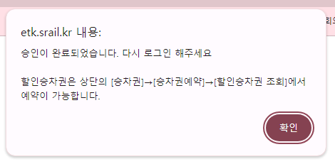 만일 아래와 같은 얼럿이 뜬다면 아직 다자녀 등록이 안되어서 할인승차권을 예매할 수가 없다고 보시면 됩니다.