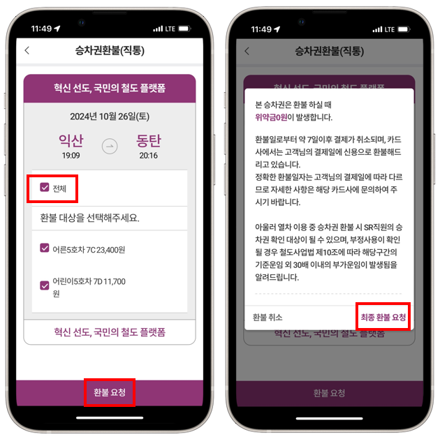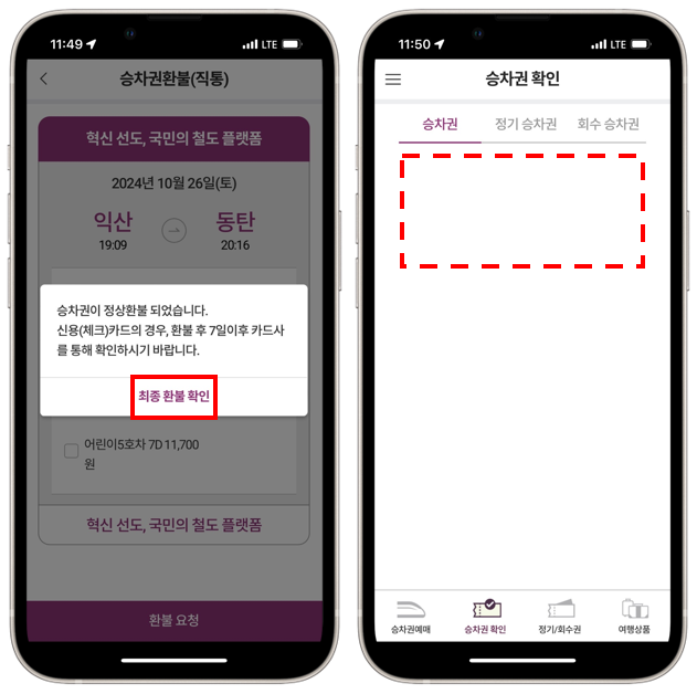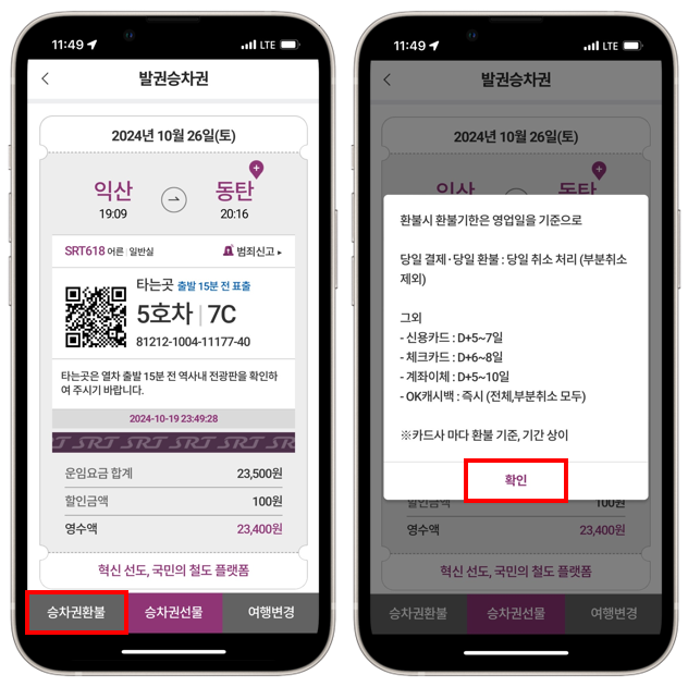 이걸 눌러주면 바로 내가 구매했던 승차권을 환불 받을 수 있습니다.